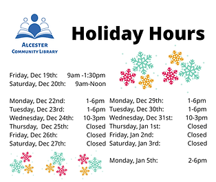We are excited you are here! The Alcester Community Library is a combination library that serves our community as well as our junior/high school students. We have a large selection of books, magazines, newspapers, and electronic resources available to be checked out by our library card holders. Also we provide programming for kids and adults. Check this site for upcoming events and programs!
